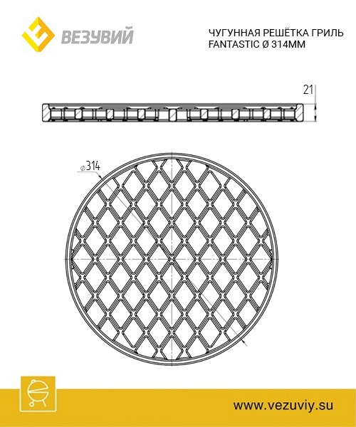 Решетка чугунная Везувий Ø 314 мм сконструирована для Очага Везувий Фантастик из жаропрочного чугуна и предназначена для приготовления продуктов на открытом огне.