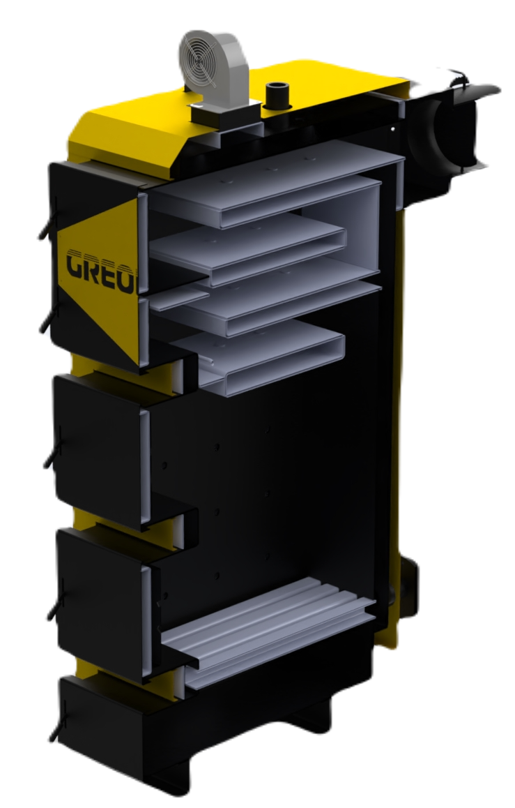 2. Эффективное сжигание топлива. Четырехходовой теплообменник полочного типа и водяные колосники обеспечивают максимальное снятие тепла.