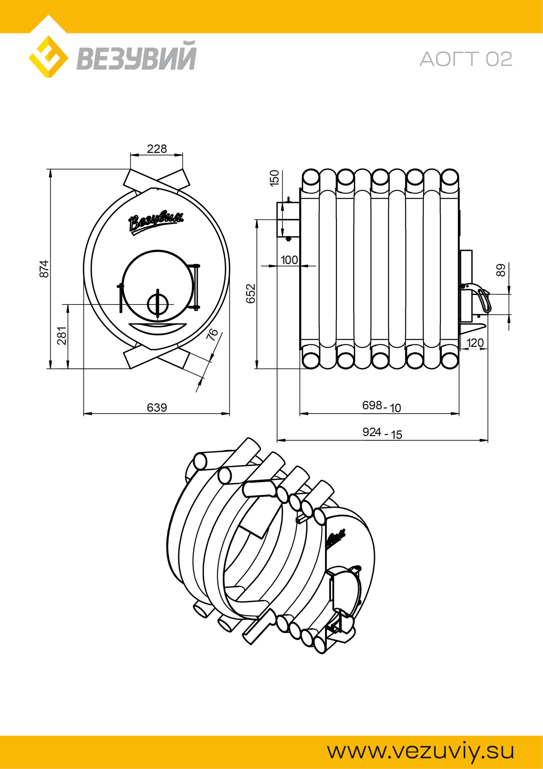 Печь отопительная Везувий АОГТ 02 предназначена для обогрева бытовых нежилых и промышленных помещений. Печь рассчитана на обогрев помещений объёмом 100 — 1000 кубических метров.