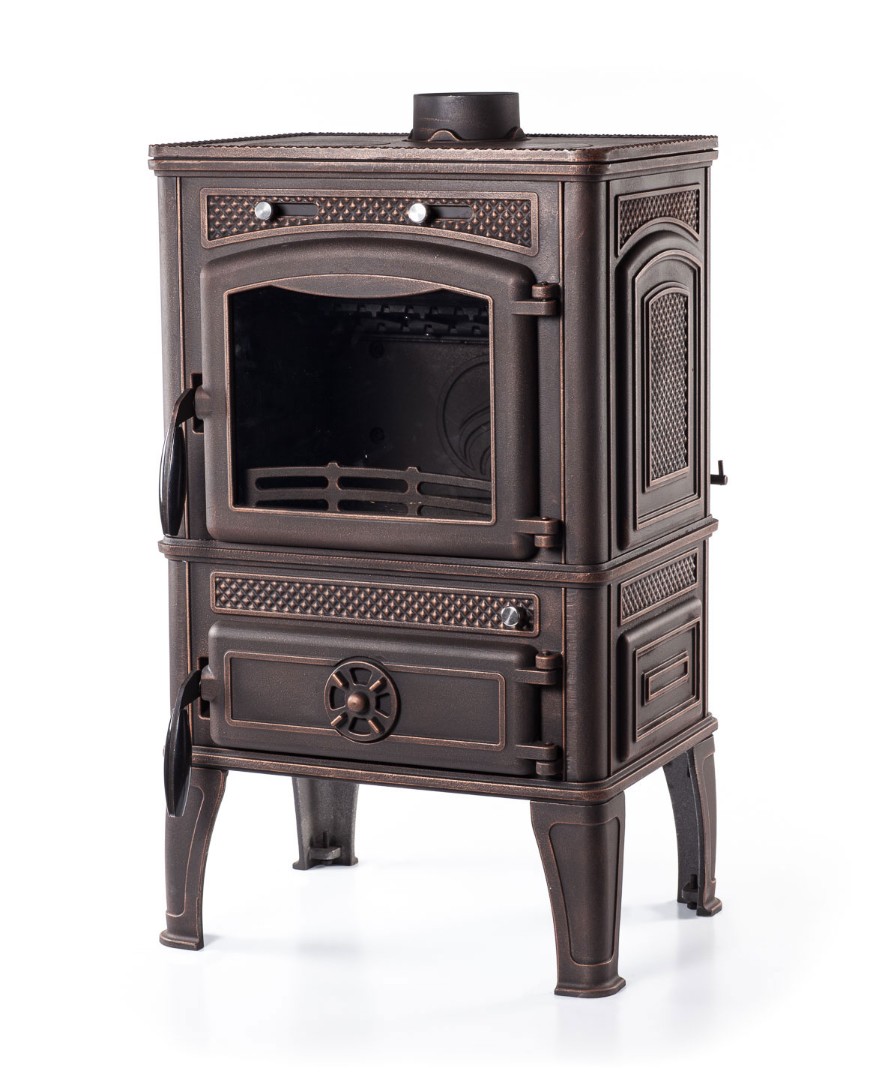 Главная особенность этой версии – стильное покрытие в цвете «патина». Винтажный дизайн с декоративным рельефом и необычным оттенком делает печь не только функциональной, но и выразительным элементом интерьера.