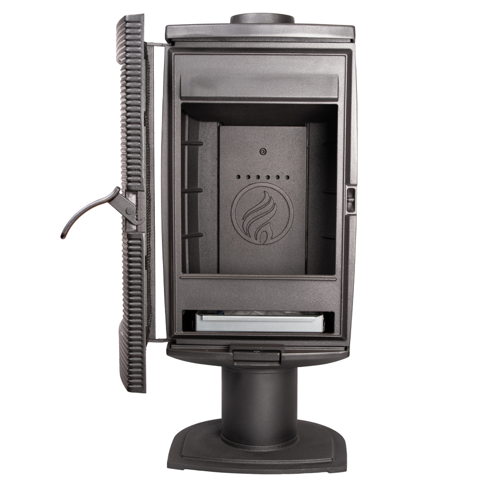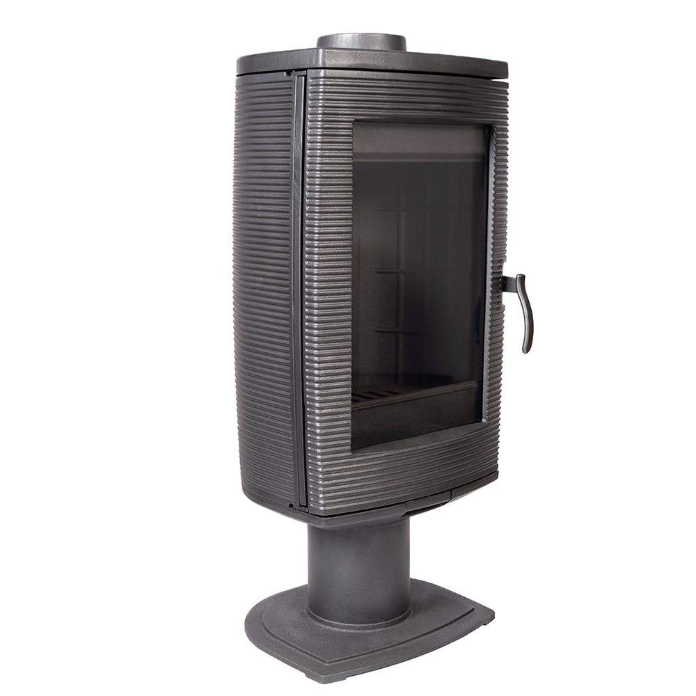 Топка с большим прямым стеклом и основанием в виде ноги делает использование печи удобным, а чугун марки СЧ20 гарантирует долговечность. Модель поддерживает приток воздуха извне, а колосниковый тип горения обеспечивает стабильное и безопасное сжигание топлива.