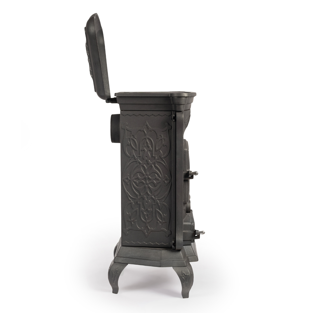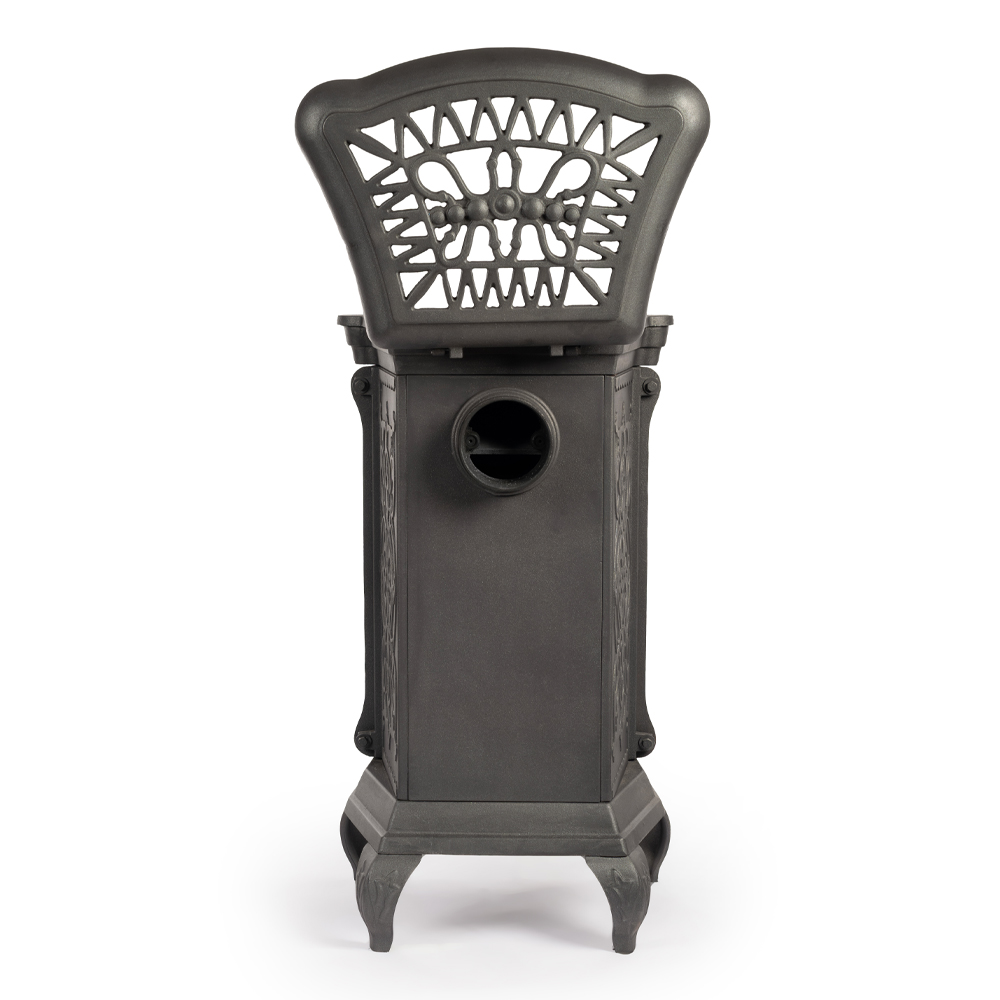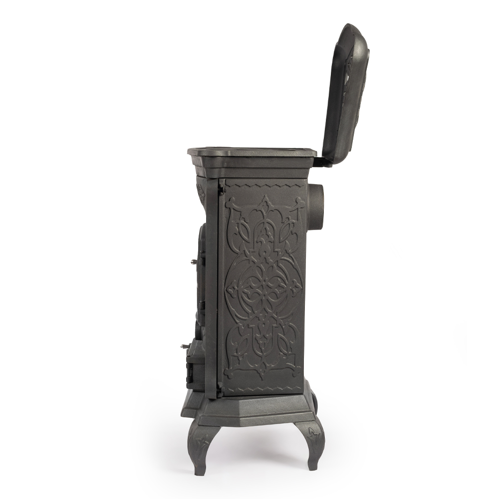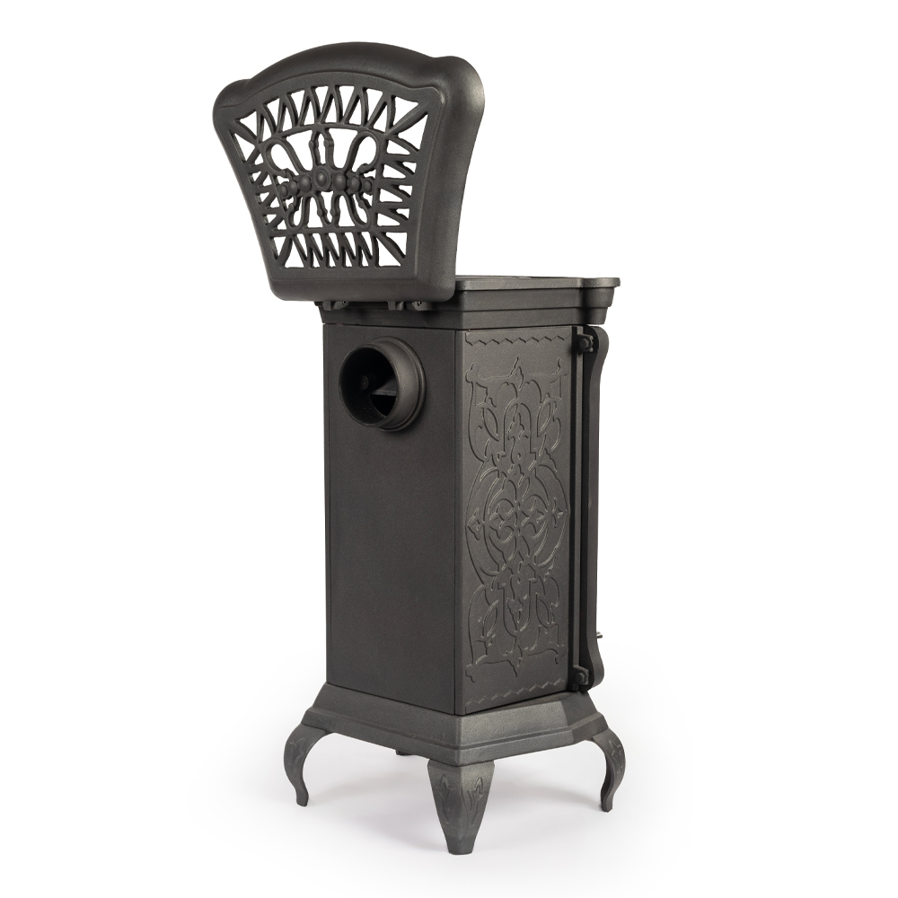 Сверху печи расположена удобная варочная поверхность, которая позволяет использовать устройство не только для обогрева, но и для приготовления пищи. В печи используется колосниковый тип горения. Дымоход диаметром 120 мм подключается к печи сзади, обеспечивая безопасное и эффективное удаление продуктов сгорания.