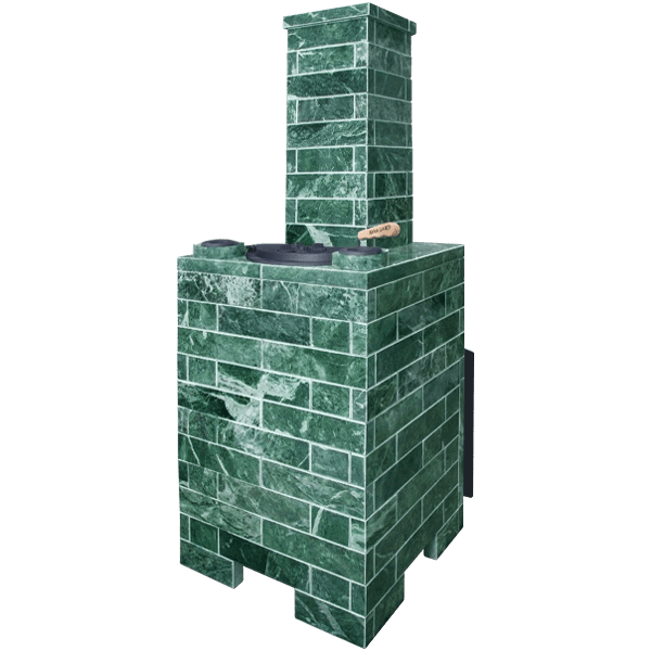 Облицовка из кирпичиков змеевика - это простой и эффективный способ создать режим русской бани. Облицовка представляет собой плитки зелёного камня с краями, обработанными фаской. Из-за этих краёв облицовка имеет чёткий рисунок, который полностью имитирует настоящую кирпичную кладку. Эта облицовка также, как и облицовка из классического кирпича, останавливает жёсткое инфракрасное излучение и конвекцию, легко собирается/разбирается и не требует никаких специальных навыков при сборке.