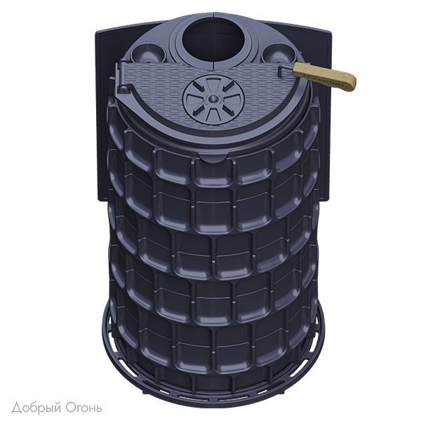 Одной из ключевых особенностей печи является массивная каменка с теплонакопительными воронками, обеспечивающая создание легкого и комфортного пара. Под каменкой, установленной на трех опорах, находится рассекатель пламени, который делит пламя на три потока. Эти потоки направляются на боковые стенки корпуса, что обеспечивает их интенсивный нагрев и способствует конвективному прогреву воздуха в парной. Для повышения эффективности нагрева на наружных поверхностях предусмотрены конвекционные рёбра. Пламя проходит через специальные выступы, поднимаясь к дымоходу и подогревая каменку.