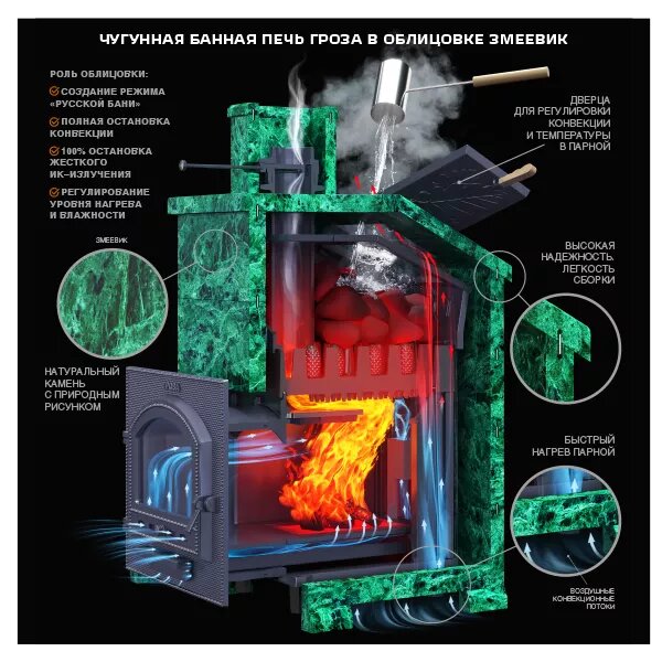 Чугунные банные печи GROZA представляют собой современные устройства, предназначенные для малых и средних парных. Эти печи обладают прочной сборной конструкцией, которая исключает использование резьбовых и сварных соединений, а все детали изготовлены из легированного чугуна. Топка печей GROZA состоит из двух камер, разделенных пламегасителем, что способствует оптимальному горению. Радиаторные выступы каменки, расположенные внутри топки, увеличивают площадь контакта огня с каменкой, что повышает эффективность теплообмена.