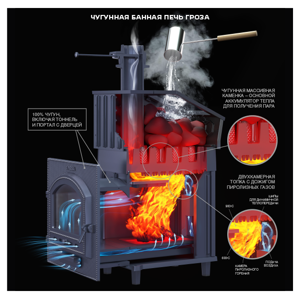 Чугунные банные печи ТМ «Гроза» — это современные печи, рассчитанные на малые и средние размеры парных. Печь имеет прочную сборную конструкцию, без резьбовых и сварных соединений, детали выполнены из легированного чугуна. Топка печей «Гроза» состоит из двух камер, разделенных пламегасителем. Радиаторные выступы каменки, направленные вглубь топки, увеличивают площадь контакта огня с каменкой и эффективность теплосъема. Для увеличения площади поверхности нагрева камней каменка снаружи оборудована чугунными шипами, направленными вверх. Между шипами укладываются банные камни или дополнительные чугунные заклады, такие как ядра и чугунные шишки. Сами чугунные шипы также являются частью заряда для лучшего испарения воды