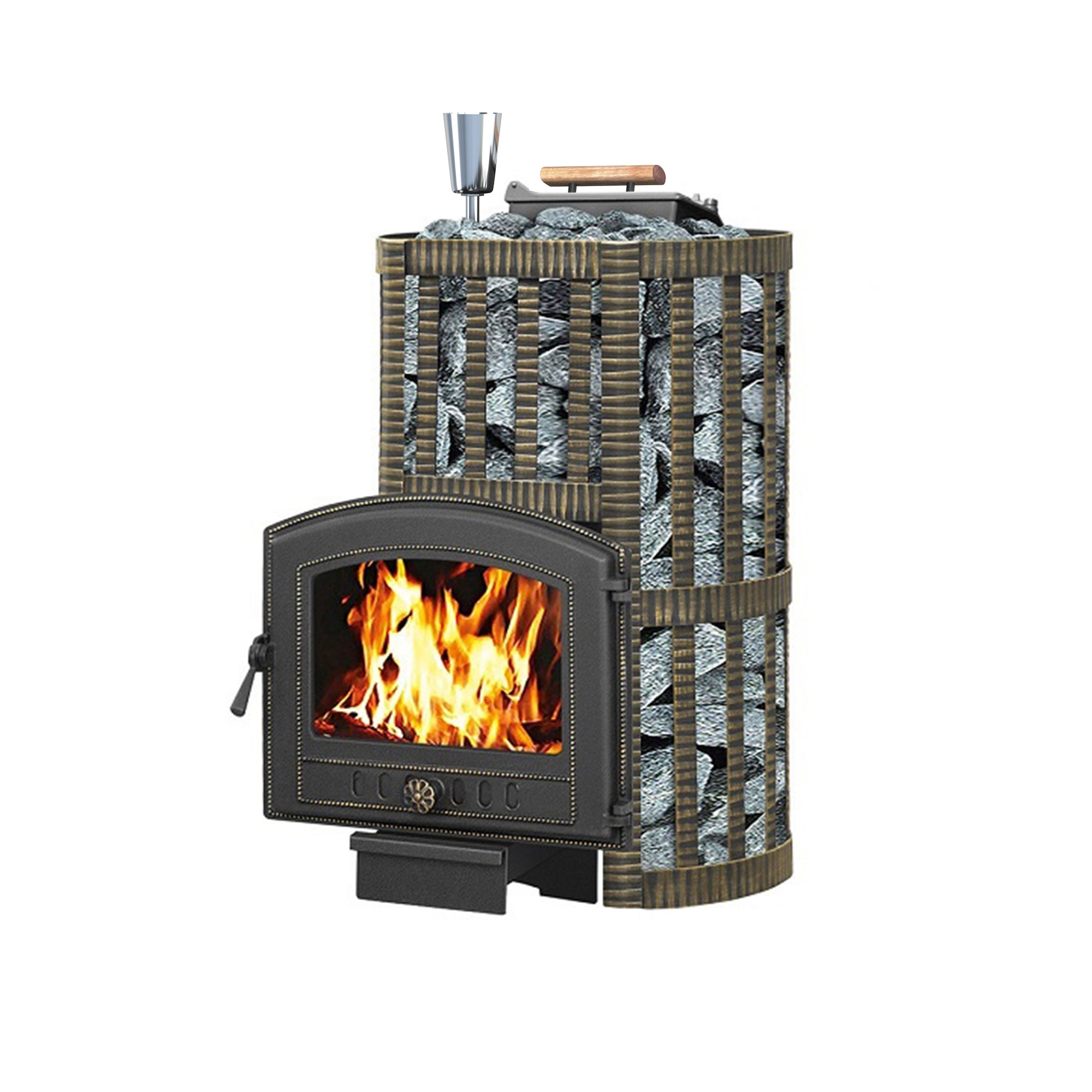 Преимущество печи в том, что она состоит из 3-х элементов. На стыке между ними используется керамический шнур с рабочей температурой 1200 градусов. То есть топка печи абсолютно герметична! Для фиксации деталей между собой применяется болтовое соединение, что даёт 100% гарантию безопасности при эксплуатации. Банная чугунная печь Ураган Ковка 16 (224) укомплектована чугунной герметичной дверцей Везувий 224 с жаропрочным стеклом «SCHOTT ROBAX». Закрытая каменка изготовлена из стали и вмещает в себя не менее 60кг камней. Конвекционно-вентилируемый кожух «Ковка» изготовлен из металлической текстурированной полосы покрашенной термостойкой краской и покрытая патиной «Бронза».