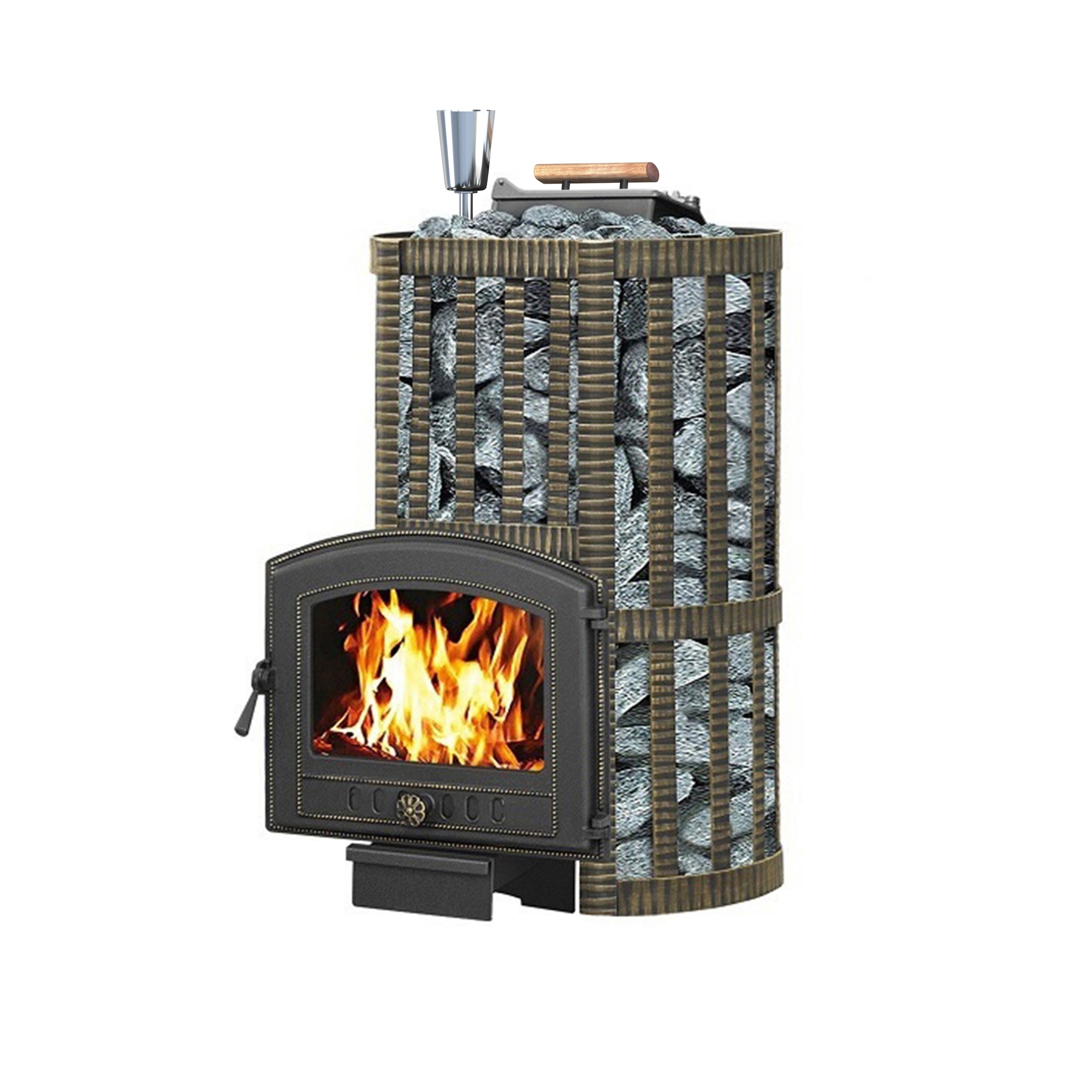 Преимущество печи в том, что она состоит из 3-х элементов. На стыке между ними используется керамический шнур с рабочей температурой 1200 градусов. То есть топка печи абсолютно герметична! Для фиксации деталей между собой применяется болтовое соединение, что даёт 100% гарантию безопасности при эксплуатации. Банная чугунная печь Ураган Ковка 22 (224) укомплектована чугунной герметичной дверцей Везувий 224 с жаропрочным стеклом «SCHOTT ROBAX». Закрытая каменка изготовлена из стали и вмещает в себя не менее 60кг камней. Конвекционно-вентилируемый кожух «Ковка» изготовлен из металлической текстурированной полосы покрашенной термостойкой краской и покрытая патиной «Бронза».