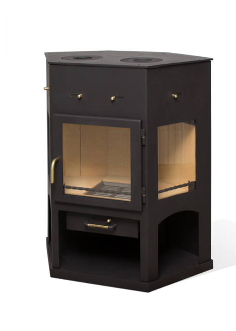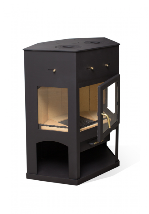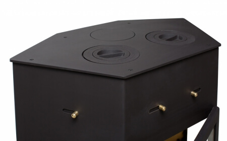 Мощная пристенная печь с большим панорамным обзором. Большая плоская дверка по центру и два боковых стекла дают максимально возможный обзор горения в большой топке. Идеально подходит для обогрева помещения площадью 55-110 м2. Верхняя крышка изготовлена их стали толщиной 10 мм и укомплектована 2 чугунными конфорками. Подсоединение к дымоходу сверху или сзади.