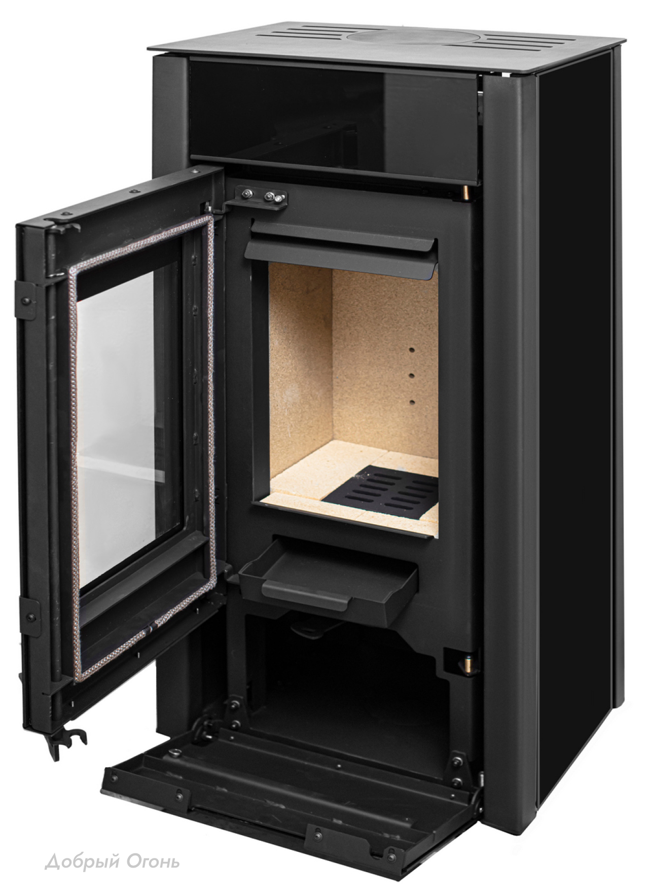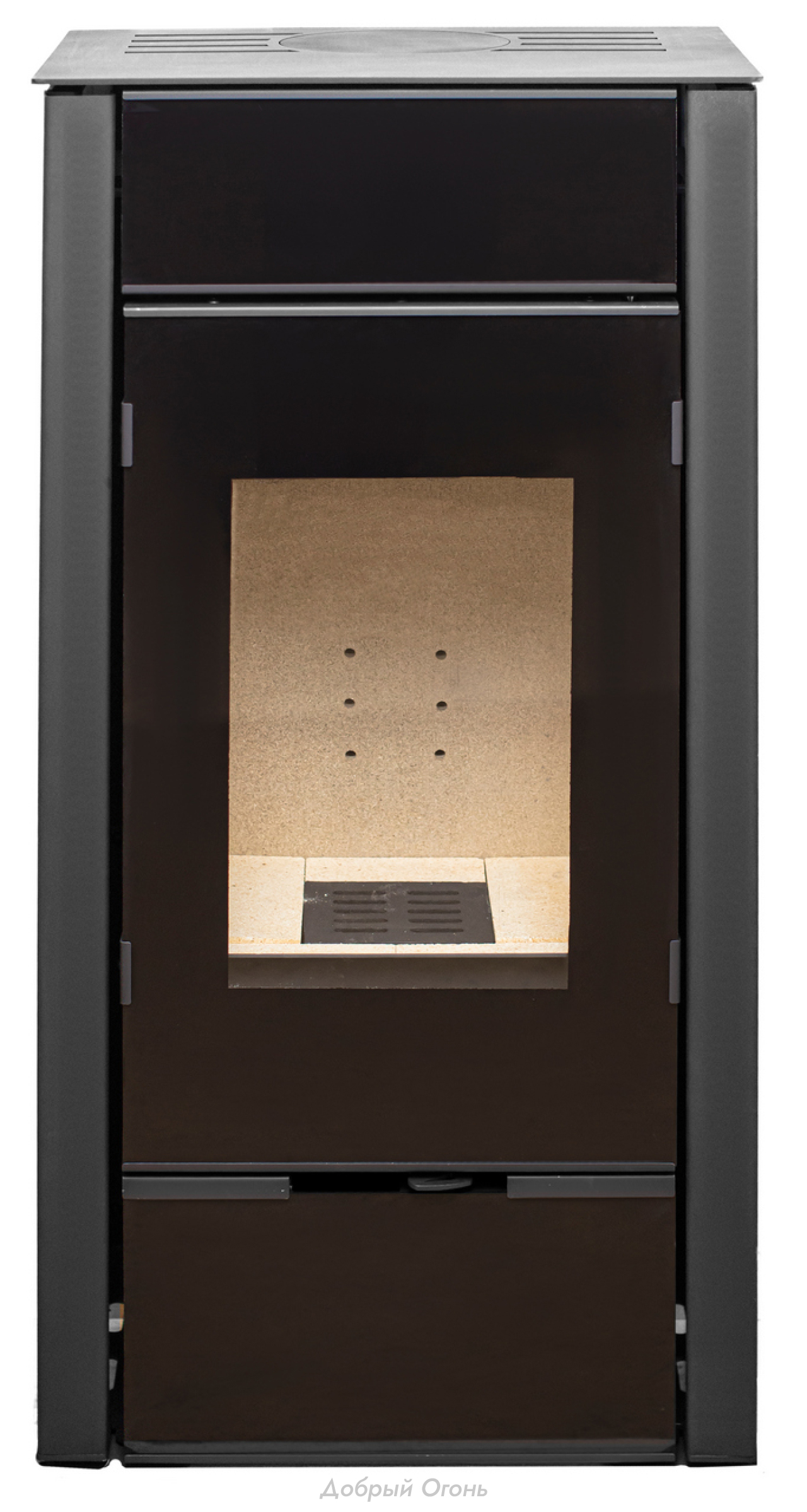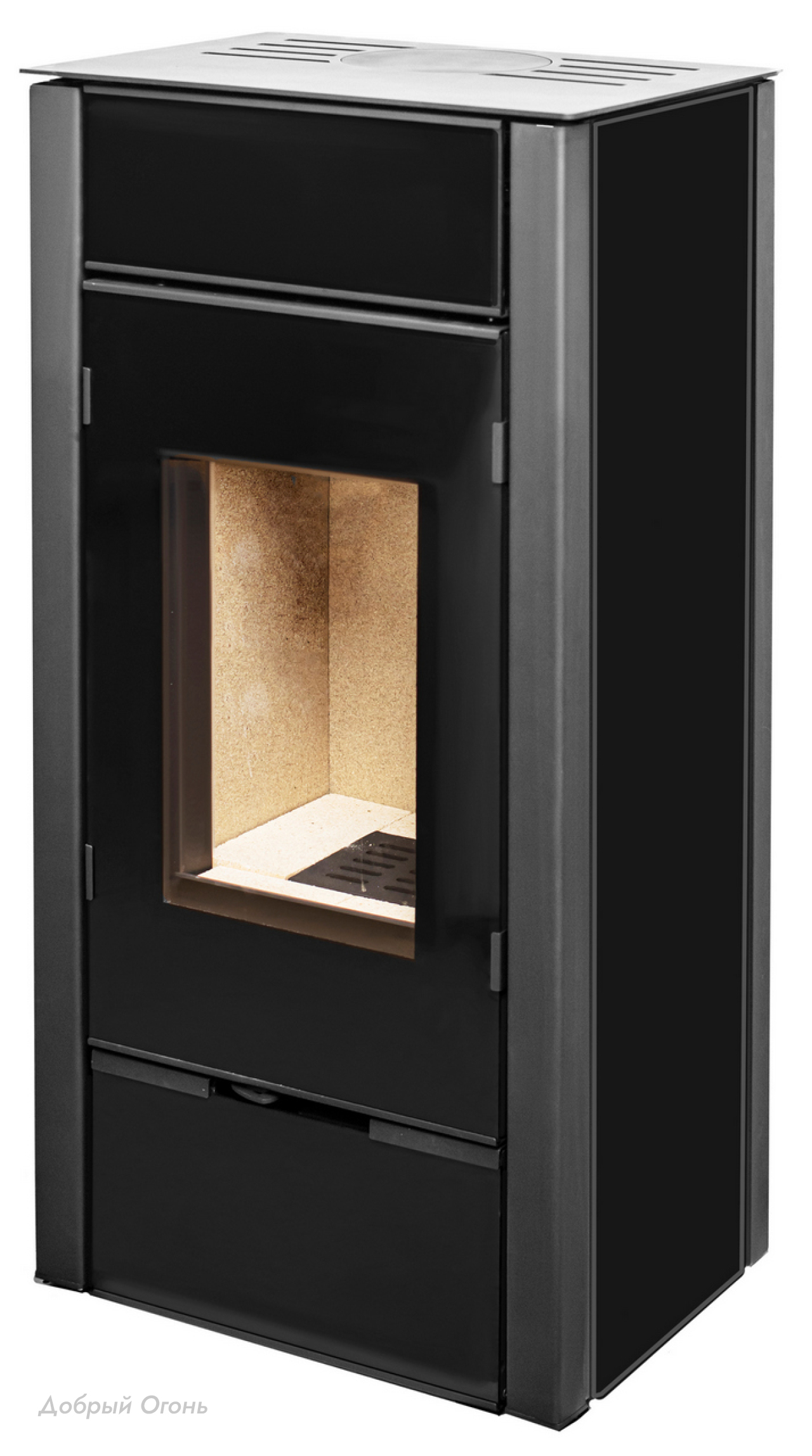 Высококачественное жаропрочное стекло с оригинальным принтингом по периметру обеспечивает не только безопасность, но и эстетическое восприятие. Боковые стенки и передняя панель, выполненные из закаленного стекла черного цвета, придают печи современный и лаконичный вид, который гармонично впишется в любой интерьер.