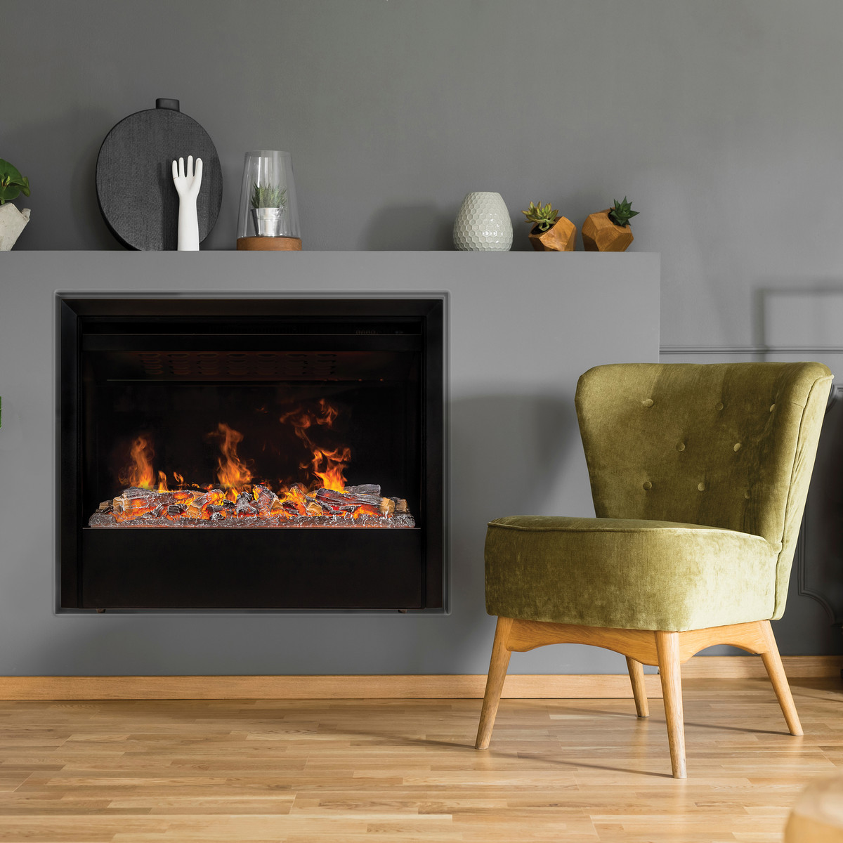 Обновленный очаг 3D нового поколения гарантирует абсолютно реалистичный эффект пламени с новым улучшенным парогенератором. Звуковой эффект горения пламени и потрескивания дров в очаге, создает неповторимую атмосферу. Одни из самых главных особенностей: внутреннее зеркальное стекло для визуального увеличения эффекта пламени.