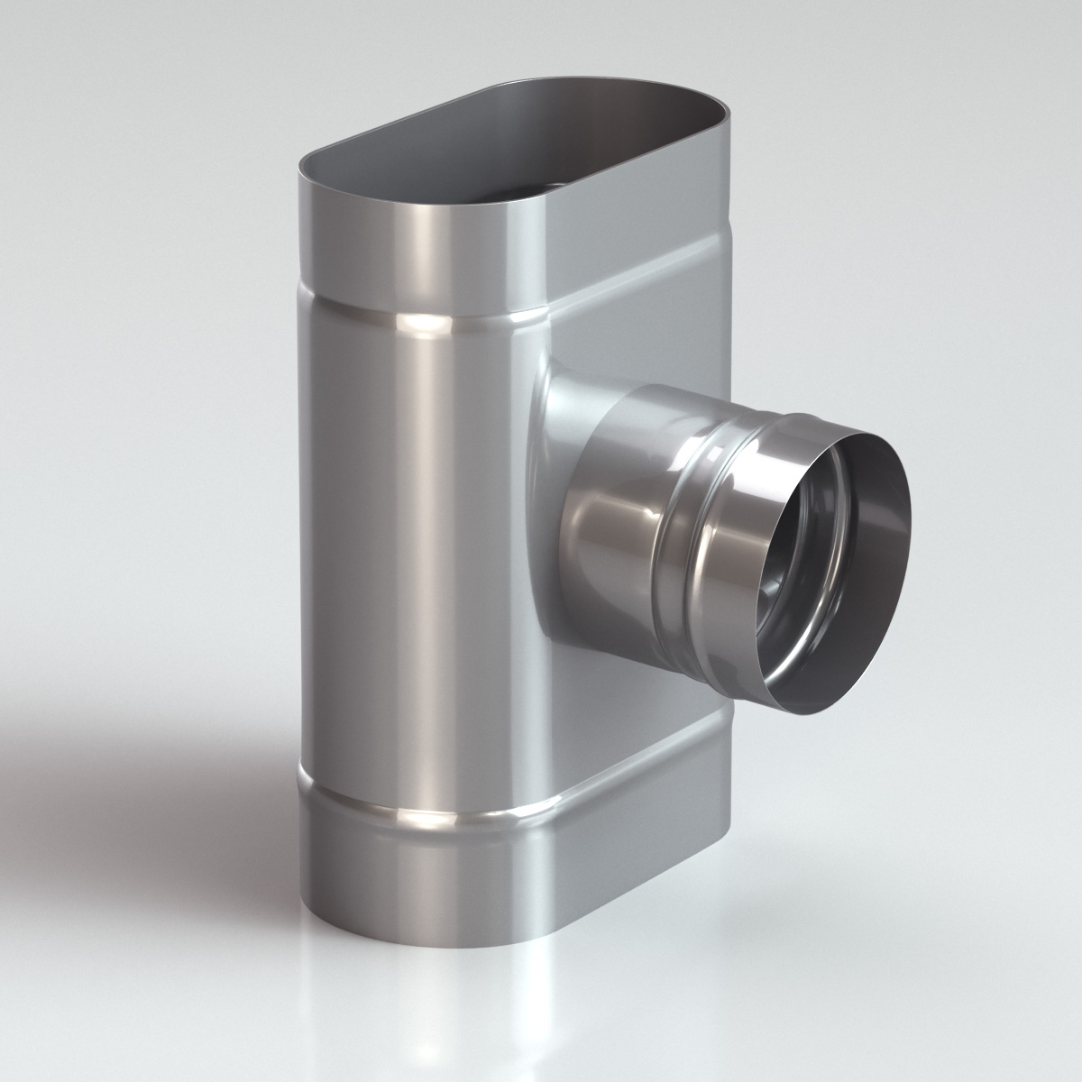 Тройник 90° овальный из нержавеющей стали — часть дымоходной системы, в котором верхний и нижний выходы имеют овальное сечение, а боковой отвод выполнен под круглую трубу. Такая конструкция применяется, когда нужно соединить овальную гильзу дымохода с круглым участком системы.