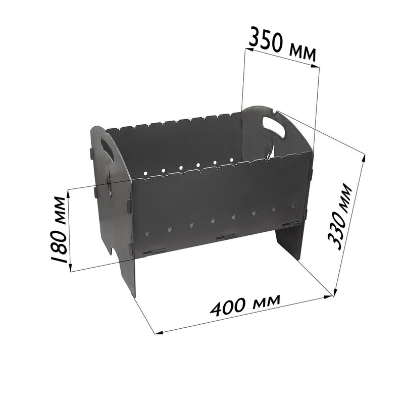 Прочная сталь толщиной 3 мм обеспечивает мангалу долгий срок службы без деформаций из-за нагрева. Предусмотрены прорези для 10 шампуров и вертела, что позволит разнообразить приготовление пищи, а отверстия для поддува помогают быстро его разжечь и держать жар равномерно по всей площади топки.