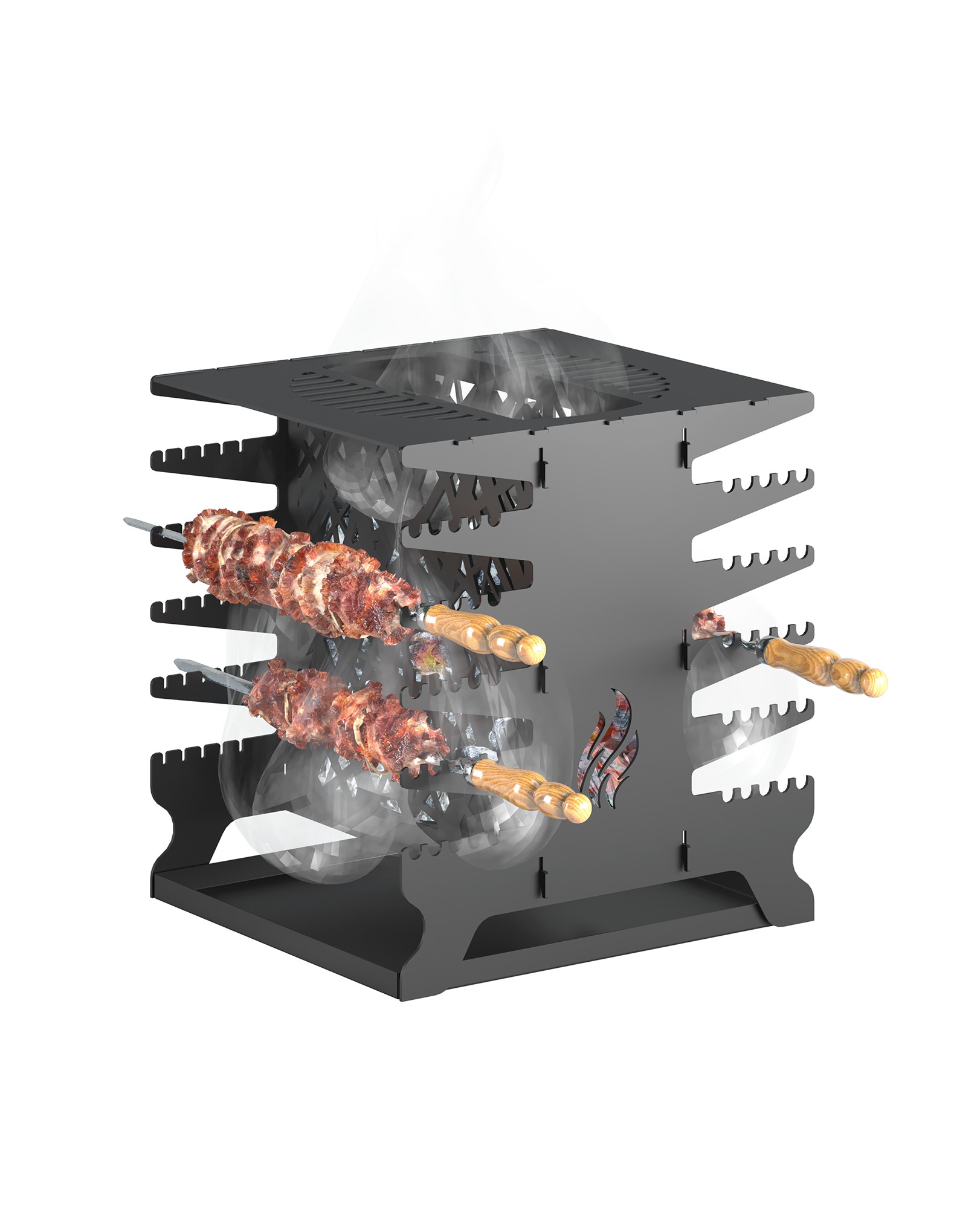 Вертикальный мангал позволяет готовить на открытом огне классические блюда: шашлык, люля, овоща на шампурах и многое другое. Конструкция мангала предотвращает попадание стекающих соков и жира в огонь, что улучшает вкусовые качества поучаемых блюд.