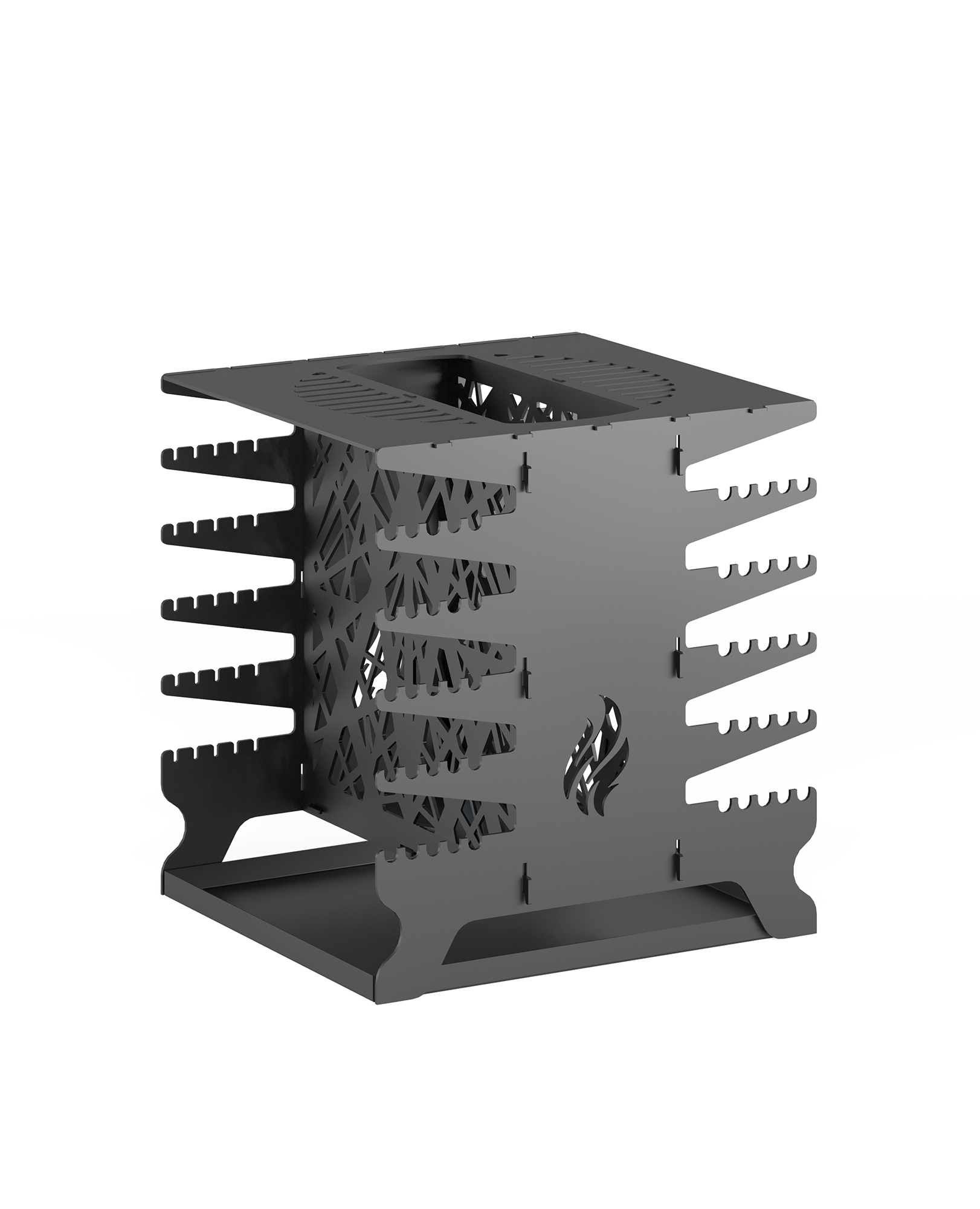 Конструкция из трёхмиллиметровых пластин легко собирается перед использованием. В сложенном виде мангал занимает минимум места в багажнике автомобиля.