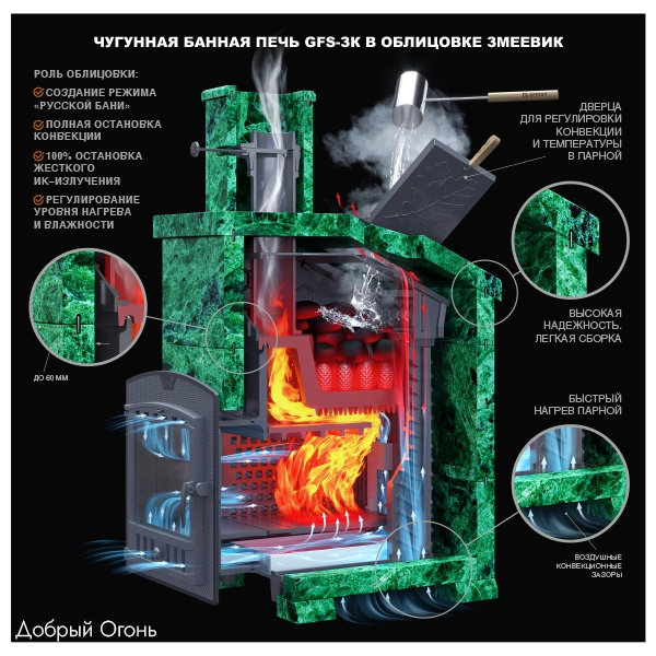 GFS-ЗК 30 — печь с усиленной каменкой большей массы, с единым углублением внутрь топки для дополнительной укладки чугунного заряда. Теплосъемные шипы, со стороны горения пламени, в разы увеличивают площадь соприкосновения огня с каменкой и ускоряют передачу тепла, а также способствуют лучшему дожигу смешивая потоки пламени и воздуха поступаемого из воздушника. Эти усовершенствования значительно повышают мощность парообразования печи и выдают большее количество пара при непрерывной подаче воды. Каменка печей GFS-ЗК является незаливаемой.