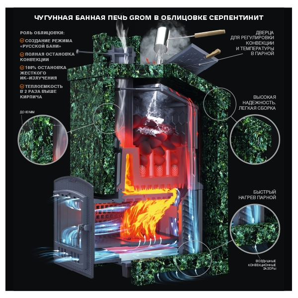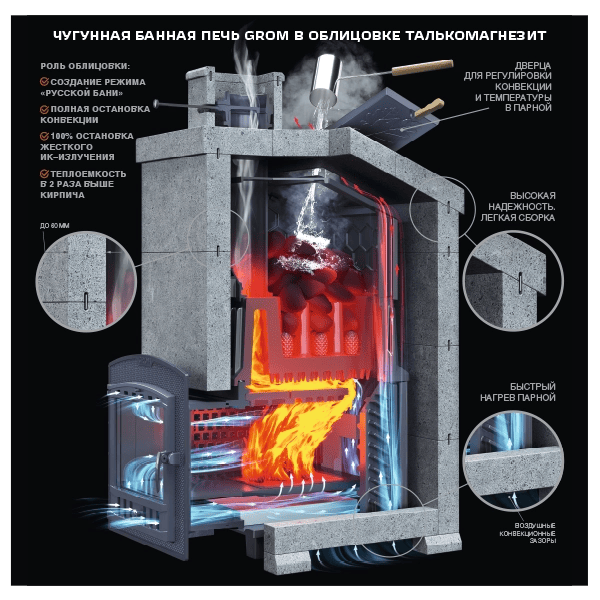 Grom – печь премиум-класса повышенной надежности для использования в средних и крупных парных, включая коммерческие бани (гарантия 2 года на коммерческое использование, 10 лет для индивидуальной эксплуатации).