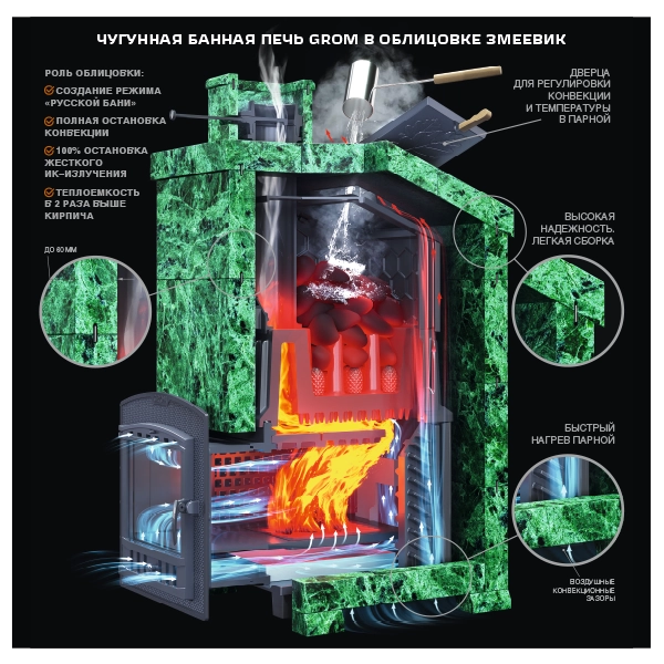 Grom – печь для бани премиум-класса повышенной надежности для использования в средних и крупных парных, включая коммерческие бани (гарантия 2 года на коммерческое использование, 10 лет для индивидуальной эксплуатации).